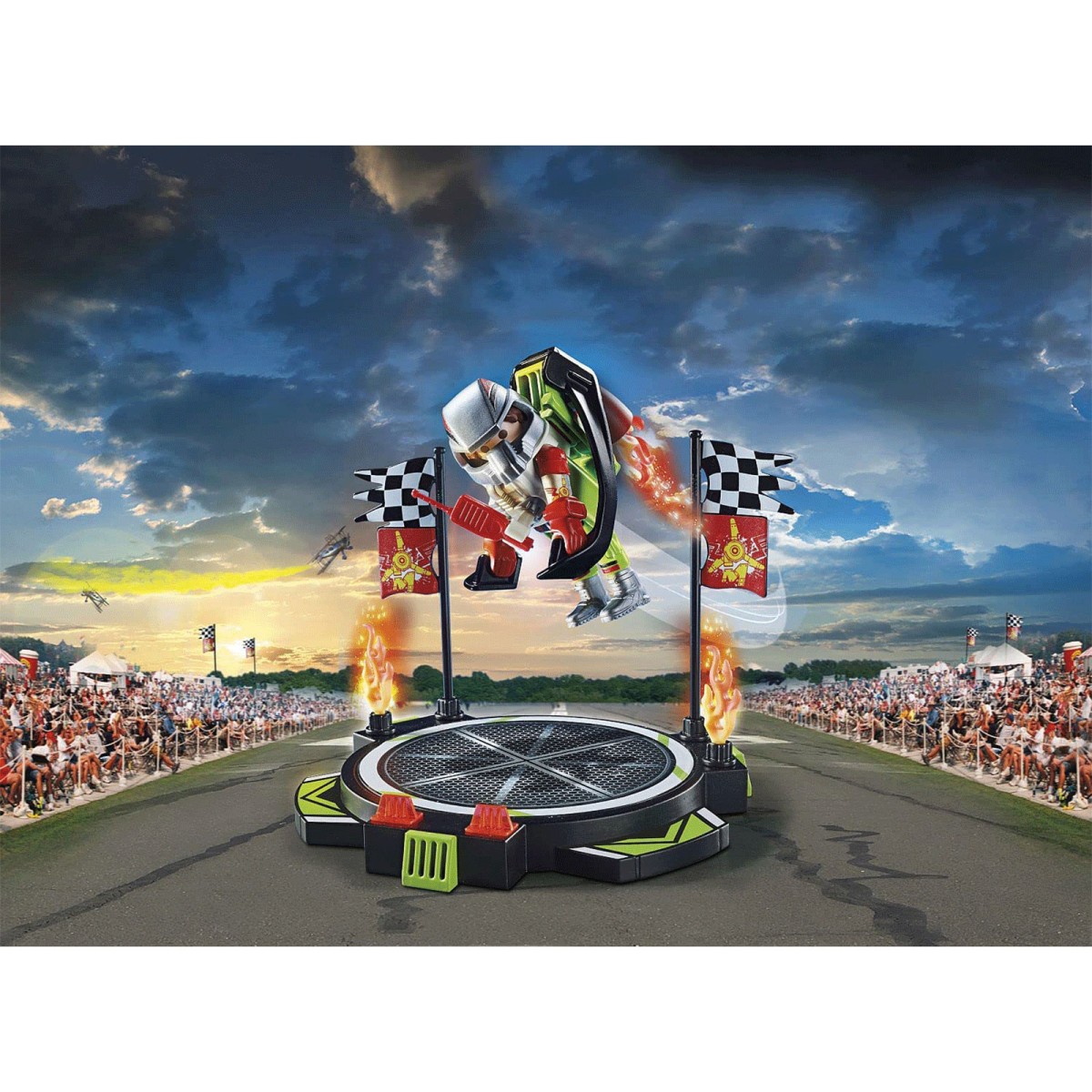 Beim Jetpack fliegen ist Präzision gefragt. Schließlich fliegt der furchtlose Playmobil-Stuntman ohne Begleitung durch die Lüfte. Erst wenn die Flugausrüstung samt Helm und Handschuhen sicher sitzt, macht sich der Stuntman bereit und geht auf dem Podest in Startposition: 3, 2, 1 und schon schießt der Jetpack-Flieger hinauf in die Lüfte. Lediglich die Flammen seiner Antriebsdüsen verraten, wo er gerade seine Bahnen zieht. Was ein Spektakel!