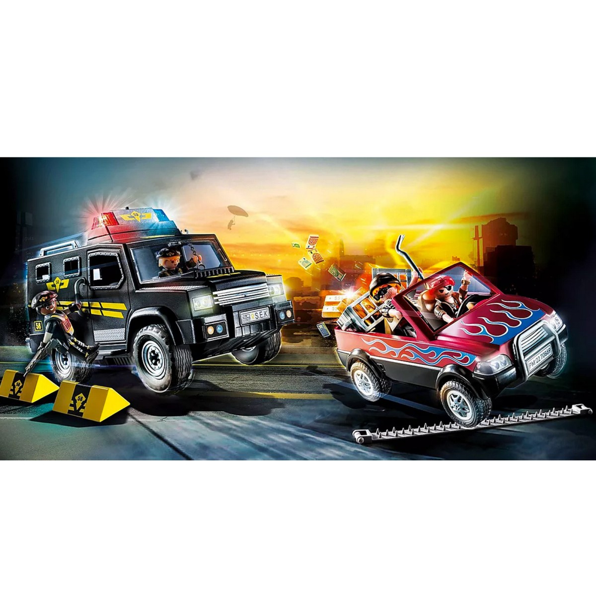 Das Playmobil Set 70869 "City Action Polizei, Verfolgung der Bankräuber" bietet mit 84 Teilen einen actiongeladenen Spielspaß. In diesem Set verfolgt die Polizei die Bankräuber mit einem gepanzerten SUV, begleitet von einer Sirene. Die Räuber befinden sich in einem auffälligen Jeep mit einem Flammen-Design auf dem Lack.
