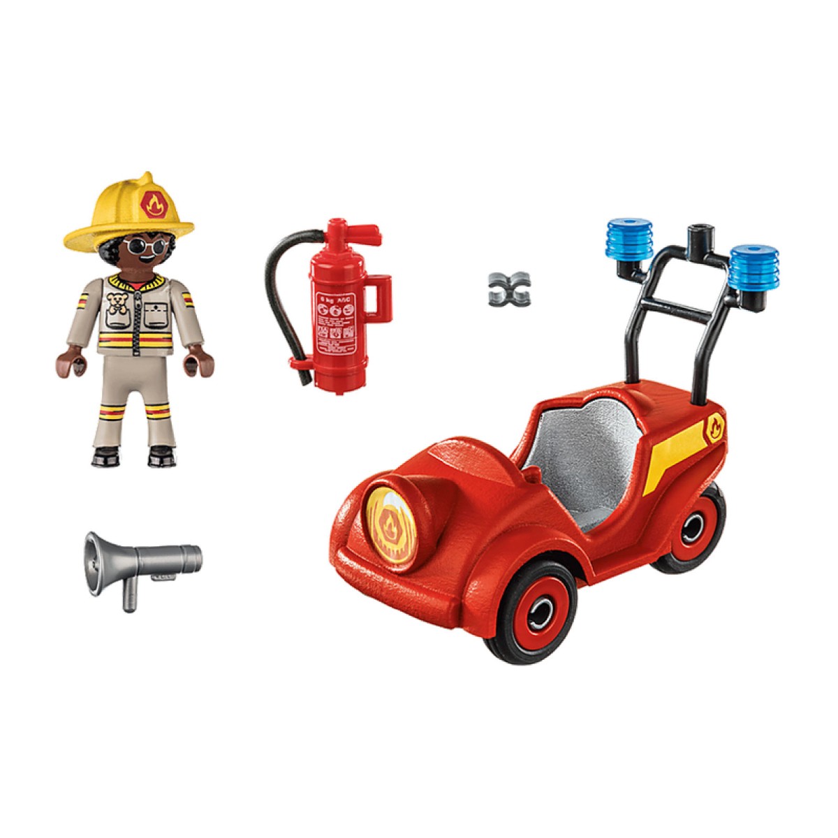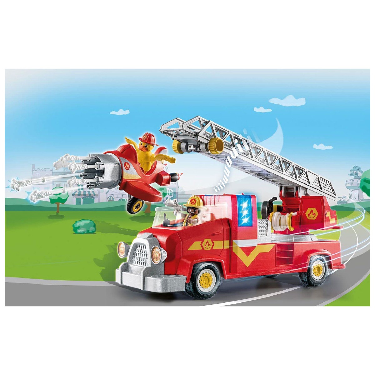 Alarm in der Feuerwehrwache – es brennt in Playmoville. Ein Fall für Feuerwehrmann Freddy Fire und seinen PLAYMOBIL Feuerwehr-Truck! In Windeseile rast das wendige Feuerwehrauto zur Brandstelle. Dort angekommen, hebt das Löschflugzeug ab und Freddy und Ducklas versuchen die Flammen mit der Wasserkanone zu löschen...