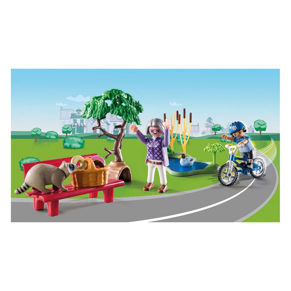 30-teiliges Spielfiguren-Set: 1 Baum, 1 Fahrrad, 2 Figuren, 1 Ente, 1 Waschbär, 24 Zubehörteile