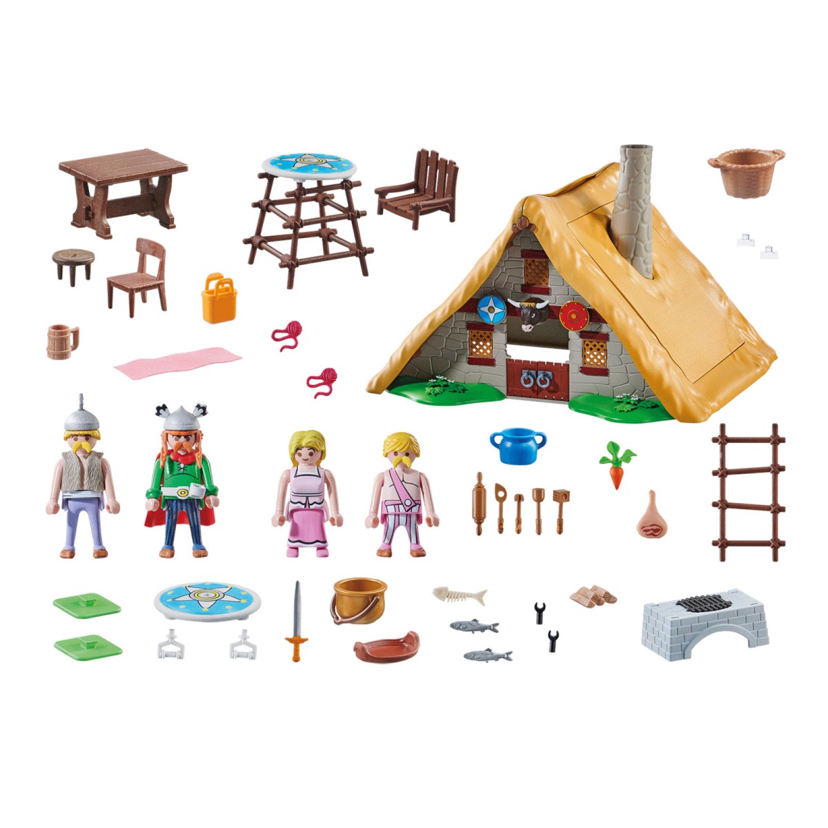 Zubehör: Majestix Hütte, 1 Häuptlingssitz, 1 Leiter, 1 Tisch, 1 Stuhl, 1 Schemel, 1 Kochstelle, 1 Suppentopf, 1 Kochwerkzeug, 1 Topf, 1 Besen, 1 Holzscheit, 1 Humpen, 1 Korb, 1 Stoffdecke, 1 Tasche, 1 Wurzel, 1 Tablett, 1 Schinken, 1 Fischgräte, 2 Wolle, 2 Standplatten, 2 Trageschilde, 2 Manschetten, 1 Schwert, 1 Gürtel, 1 Gürtelöse, 1 Helm mit Flügeln, 1 Gallier-Helm, 1 Umhang, 2 Griffe, 2 Fußklemmungen