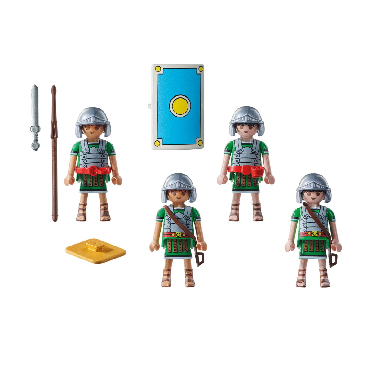 Dieses Spielset enhält 27 Teile: 4 Römer, 4 Standplatten, 4 Schwerter, 4 Speere, 4 Schilde, 4 Helme und 4 Gürtel.