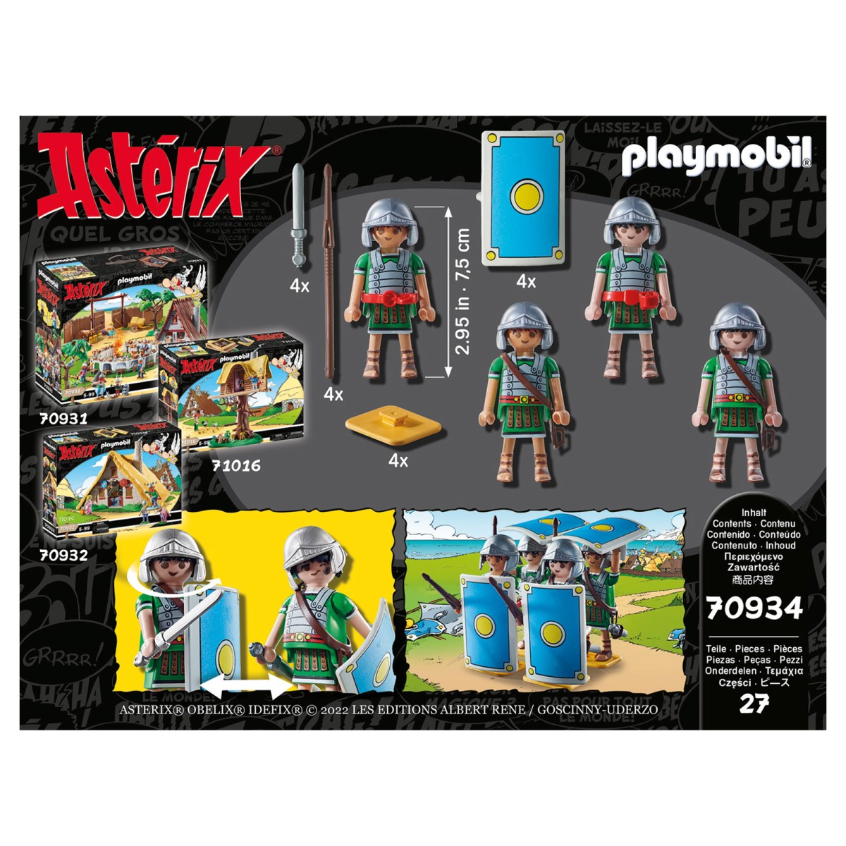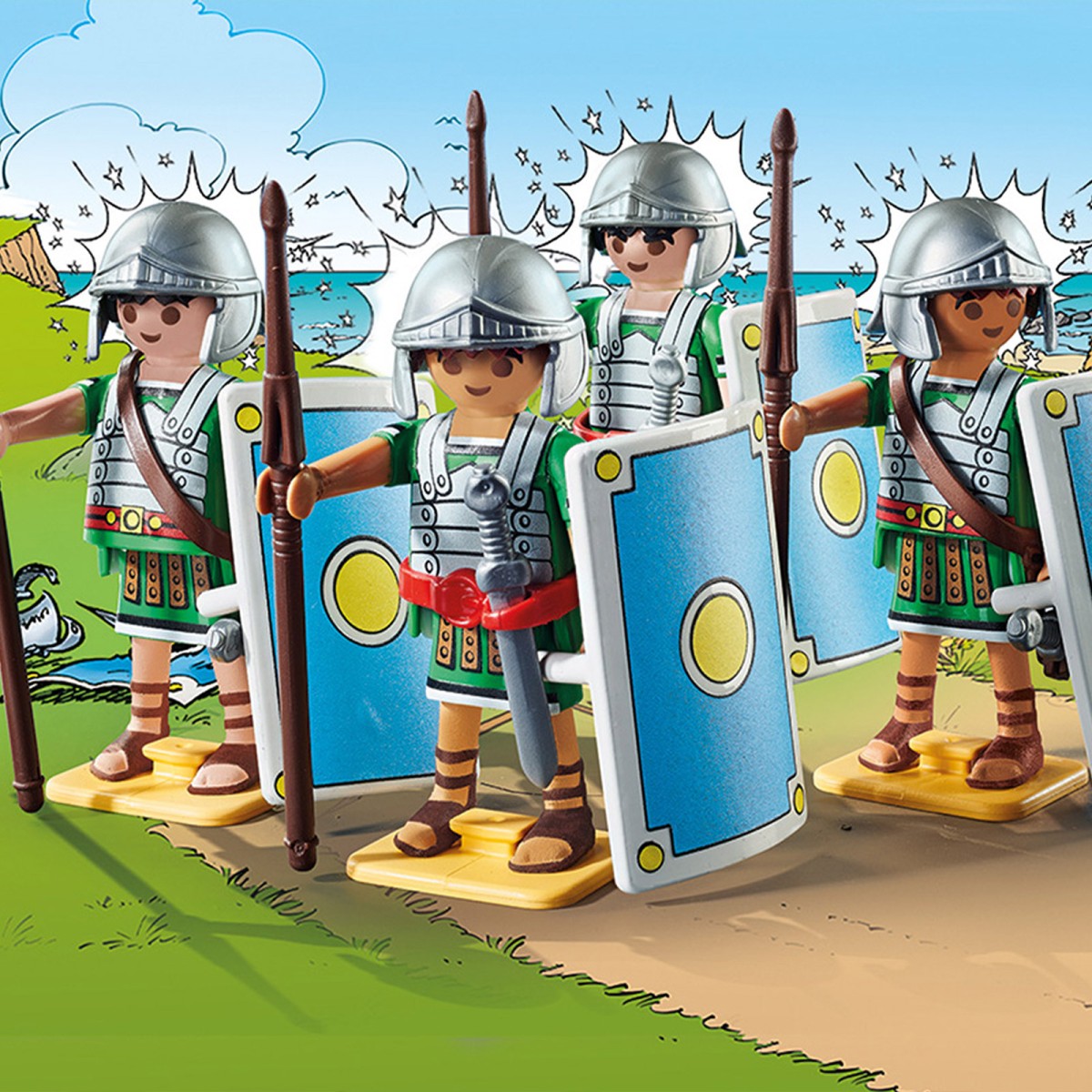Wir schreiben das Jahr 50 v. Chr. Seit vielen Monaten versuchen die römischen Legionäre, die als Besatzung in den Lagern Babaorum, Aquarium, Laudanum und Kleinbonum stationiert sind, ein kleines Dorf voller unbeugsamer Gallier einzunehmen, das nicht aufhört, dem Eindringling Widerstand zu leisten. Um die Gallier endgültig zu schlagen, greifen die Römer mit ihrer berühmten Schildkrötenformation an. Bei dieser speziellen Angriffsformation bahnen sich die Soldaten geschützt durch Schilder vorne und oben ihren Weg. Doch auch diesmal haben Asterix, Obelix und die Dorfbewohner nicht vor, sich widerstandslos zu ergeben. Schnell ein Schlückchen Zaubertrank trinken und dann gehts ab ins Gefecht. Das Leben ist nicht leicht für die römischen Legionäre, die es mit diesen Galliern zu tun haben. Das PLAYMOBIL-Set besteht aus vier Römern mit Helmen, Schwertern und Schilden. Für einen stabileren Stand ist jeder Figur eine Standplatte beigelegt. Alle Figuren haben ein Wechselgesicht, dass die Gesichter vor und nach dem Kampf zeigt.