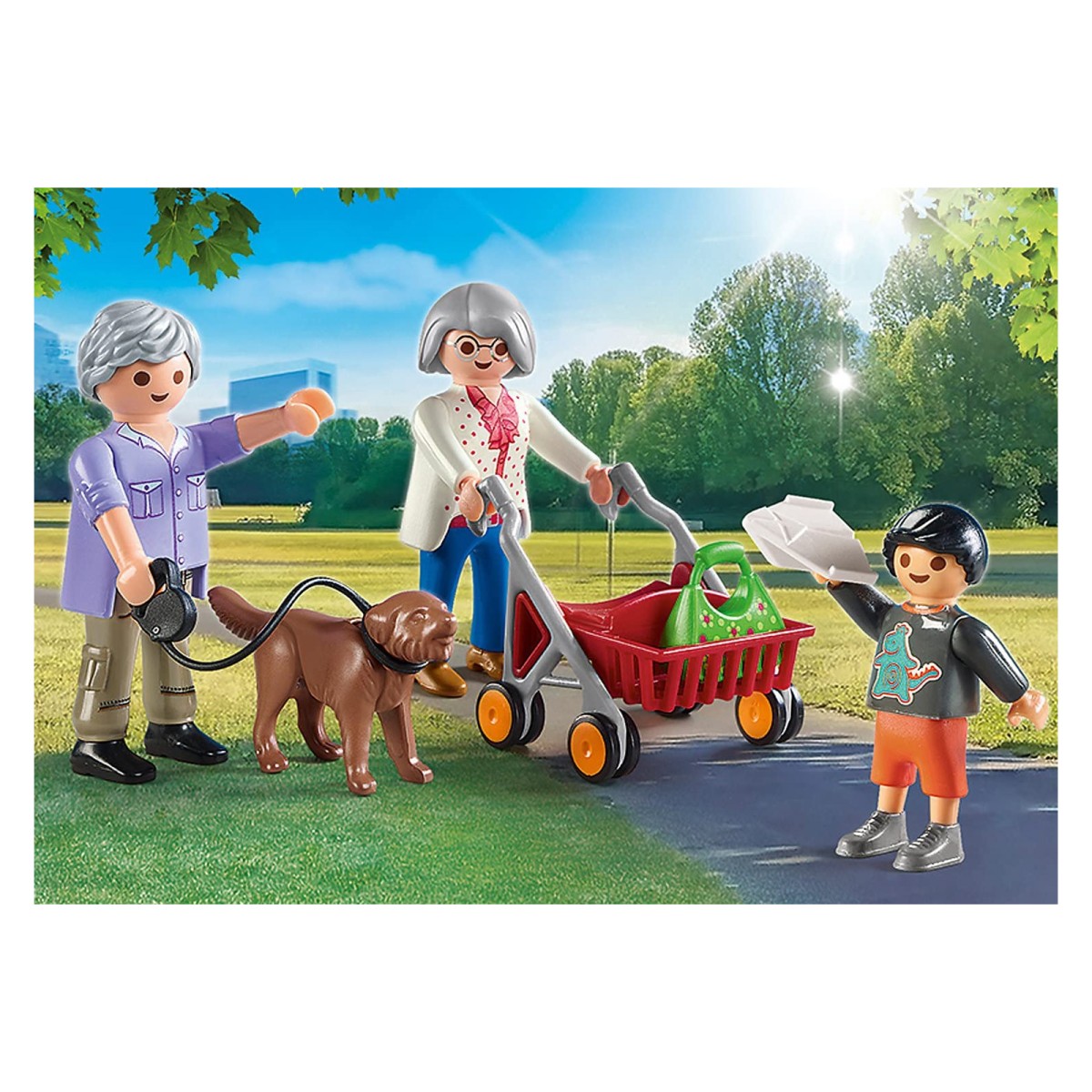 Die Großeltern lieben es, spazieren zu gehen. Jeden Tag sind sie draußen und genießen die Zeit an der frischen Luft. Heute ist ihr Enkel zu Besuch und freut sich schon auf den Rundgang durch den Park, denn er möchte unbedingt seinen neuen Papierflieger testen. Schnell läuft er vorneweg und macht die ersten Wurfübungen. Mit ihrer Gehhilfe lässt Oma es lieber ruhig angehen. Das Set enthält zwei Großeltern und eine Kinderfigur, einen Hund, einen Papierflieger, eine Gehhilfe und weitere Extras.