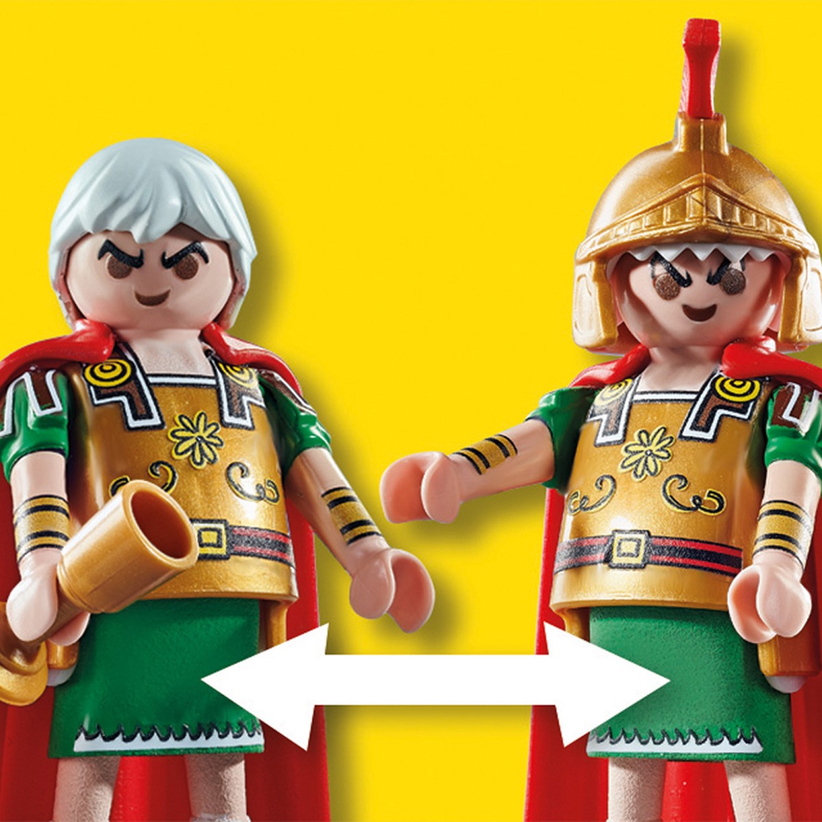- Römer-Figuren in Rüstung und mit abnehmbaren Umhängen, Caius Bonus mit Wechselperücke, Generalszelt mit Teppich, Bett, Hocker, Stuhl und Zubehör