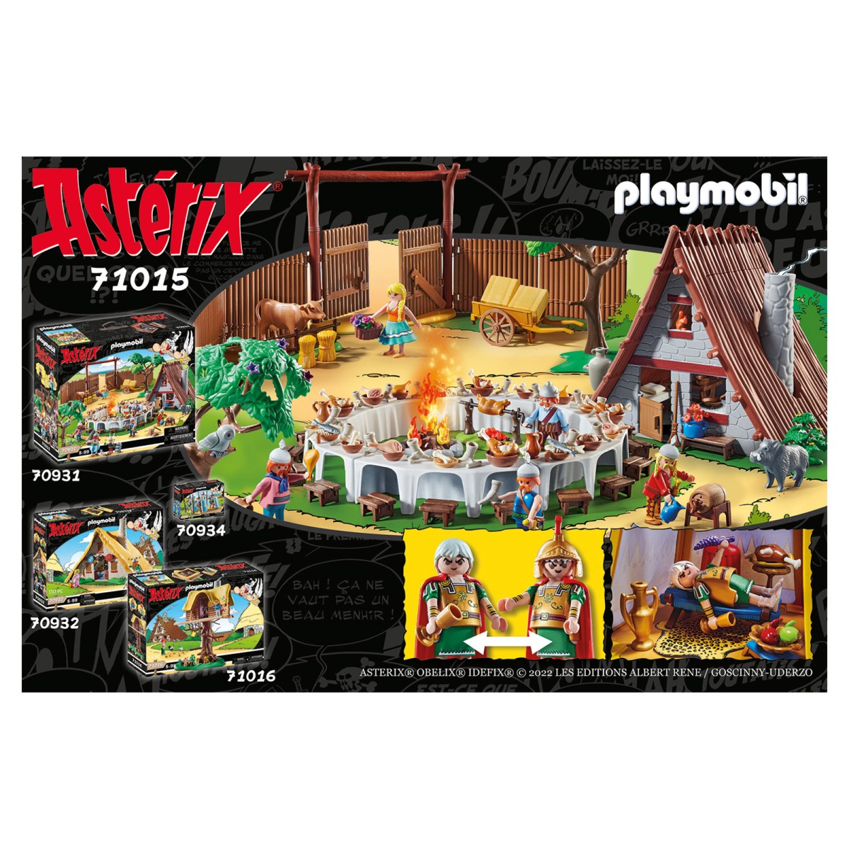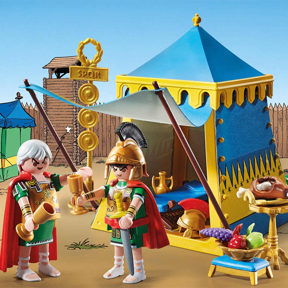 Eine der Lieblingsbeschäftigungen von Obelix ist es, Römer zu verprügeln. Sobald sich die Römer aus einem ihrer Lager herauswagen, sind sie leichte Beute für den dicken Gallier. Doch im Moment beraten die beiden Generäle Gaius Bonus und Marcus Sacapus über eine neue Strategie, um die unbeugsamen Gallier aus ihrem Dorf zu vertreiben. Sie sitzen in ihrem reich ausgestatteten Anführerzelt, lassen sich ein Stück Fleisch und ein Glas Wein schmecken und überlegen, was sie als Nächstes unternehmen sollen. Das PLAYMOBIL-Set enthält die Generäle Gaius Bonus und Marcus Sacapus in Rüstung mit Umhang und Helm, ein Generalszelt mit Teppich, Bett, Hocker und Stuhl und viele weitere Extras für spannende Abenteuer.