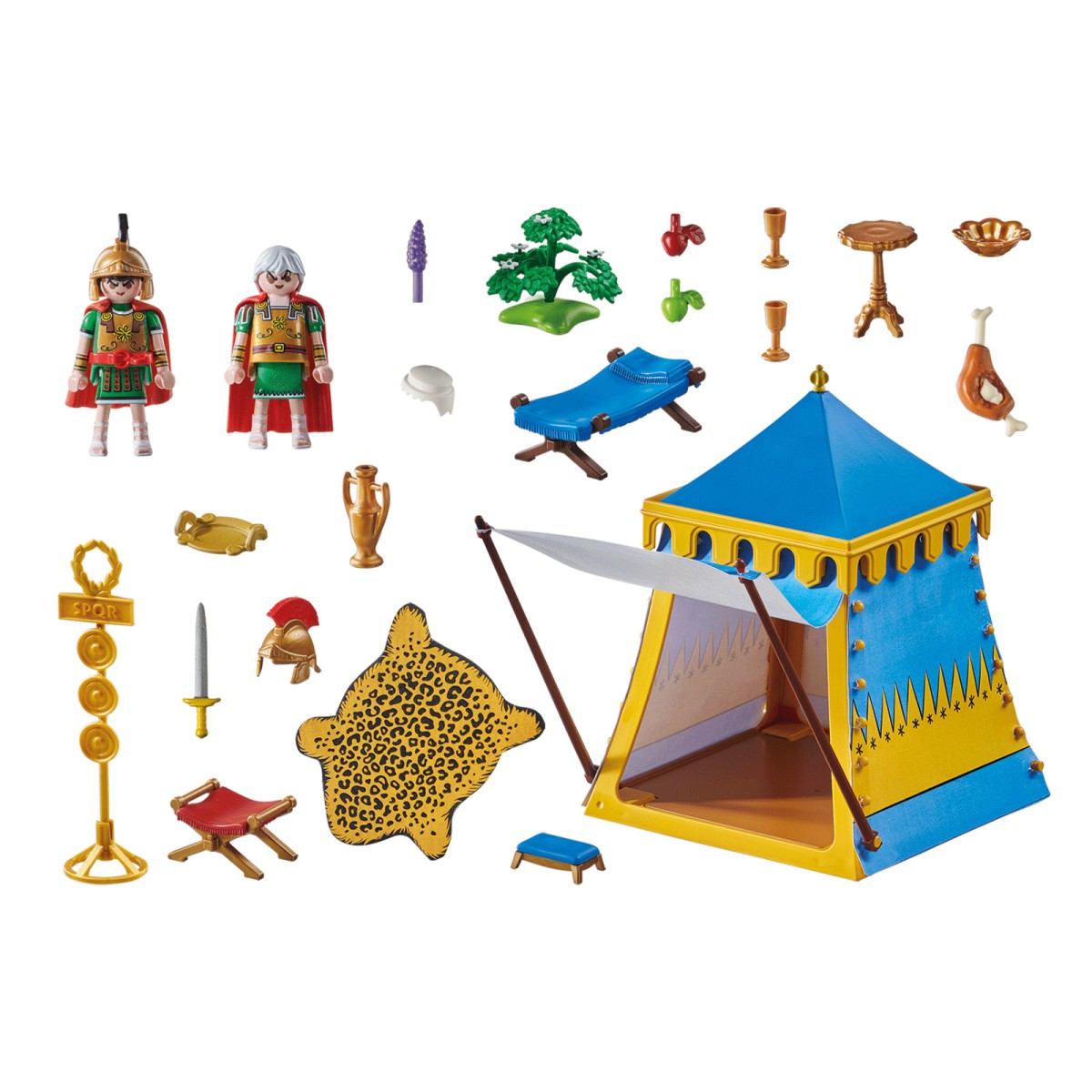 Dieses Spielset enthält 1 Caius Bonus Figur, 1 Marcus Ecus Figur, 1 Zelt, 1 Teppich, 1 Bett, 1 Hocker, 1 Stuhl, 1 Tisch, 1 Trog, 2 Becher, 1 Schale, 1 Tablett, 1 Fleisch mit Knochen, 1 Standarte, 2 Äpfel, 1 Traube, 1 Wechselperücke, 1 Pflanze, 2 Helme, 2 Umhänge und 1 Gürtel.
