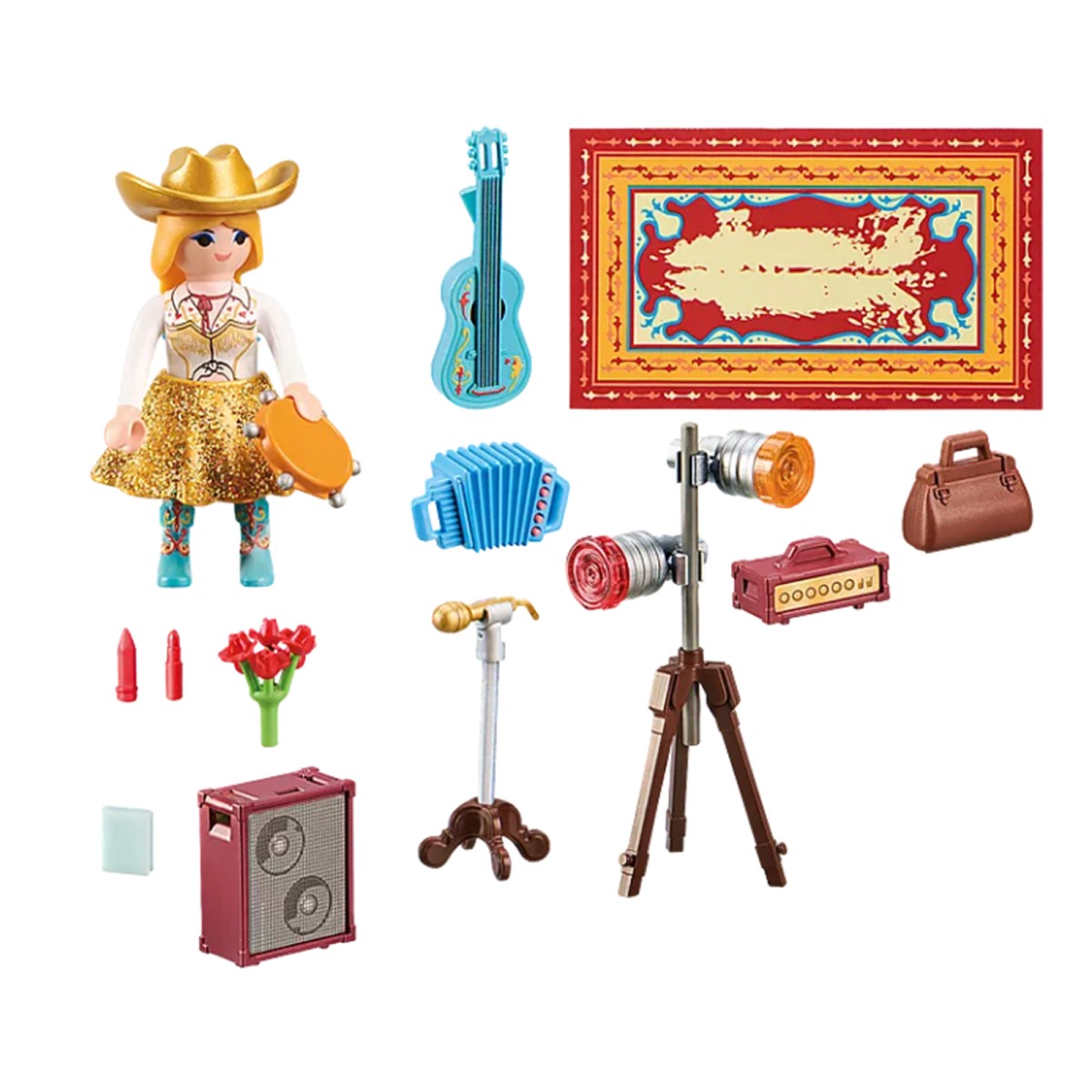 Dann ist das PLAYMOBIL-Geschenkset Countrysängerin genau das Richtige. Auf der Bühne ist die Sängerin voll in ihrem Element. Am liebsten singt sie ihre eigenen Songs und begleitet sich dazu mit der Gitarre. Doch auch Tamburin und Akkordeon beherrscht die begabte Musikerin perfekt.