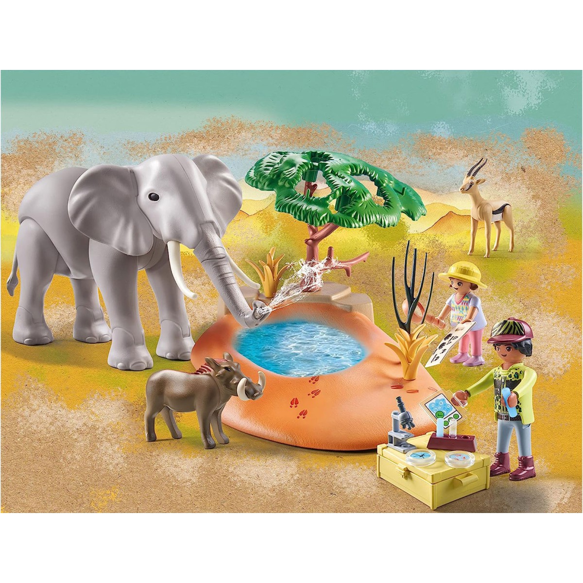 Nachhaltiges WILTOPIA-Spielset von PLAYMOBIL mit Rick und Lu Palmer, Elefant, Antilope, Warzenschwein, Wasserloch und weiteren Extras für tierische Rollenspielabenteuer im Kinderzimmer.