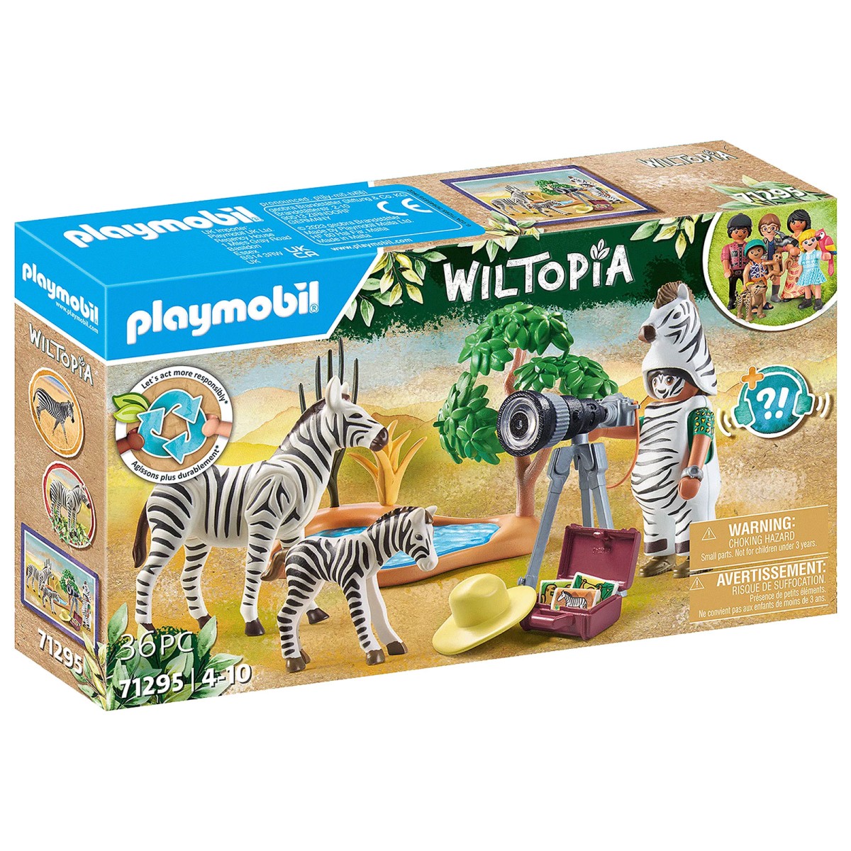 Nachhaltiges WILTOPIA-Spielset von PLAYMOBIL mit Sofia Palmer, Zebra mit Fohlen sowie einem Zebra-Kostüm zum Anziehen, Fotoapparat und vielen weiteren Extras für aufregende Fotosafaris im Kinderzimmer.