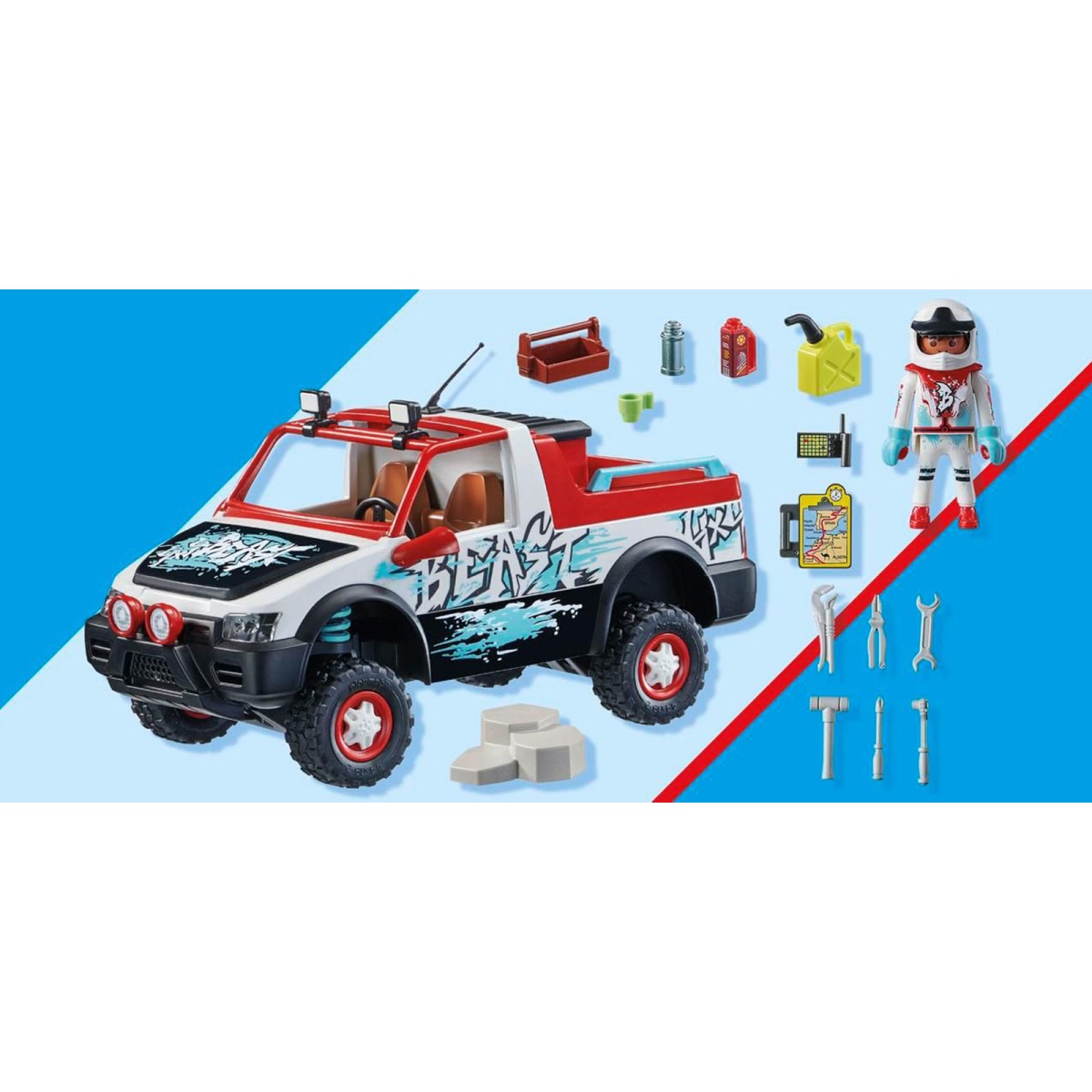 Setz den Helm auf und begib dich mit dem PLAYMOBIL-Rallyefahrer in das nächste Rennen. Dank seiner flexiblen Vorderachse meistert das Fahrzeug jedes Terrain mühelos. Wenn du die Motorhaube öffnest, enthüllt sie den Blick auf den Motorblock. Um die Figuren einzusetzen, entfernst du einfach den Überrollbügel.