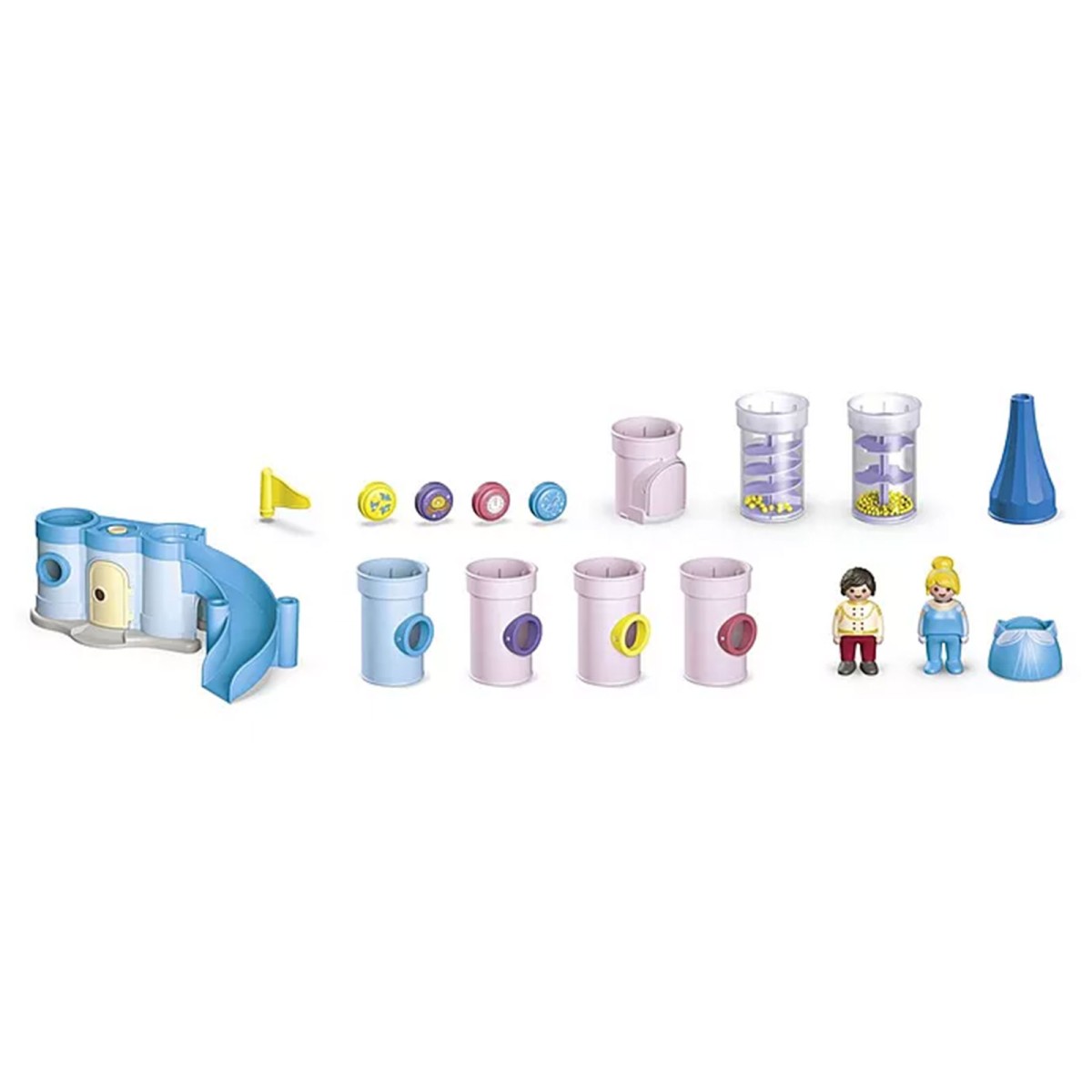 2 Figuren, 1 Schloss-Basiselement mit Rutsche, 6 farbige Türme, 2 transparente Türme, 3 Turmdächer, 3 Fahnen, 4 Fenstersteckelemente