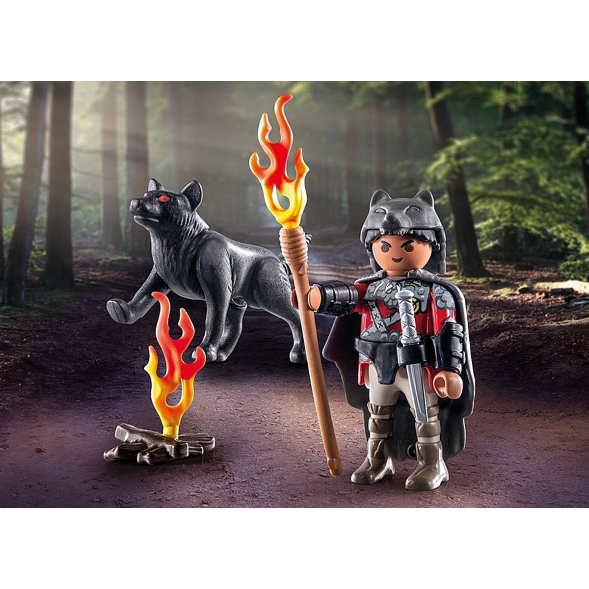 Figuren: 1 Mann; Tiere: 1 Wolf; Zubehör: 1 Lagerfeuer, 1 Messer, 1 Umhang, 1 Wolfsmütze, 1 Stab mit Fackel
