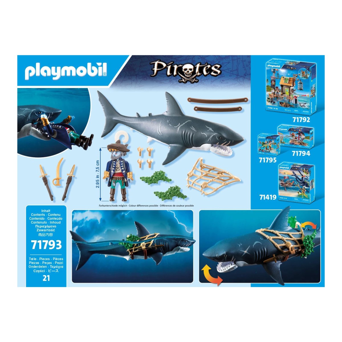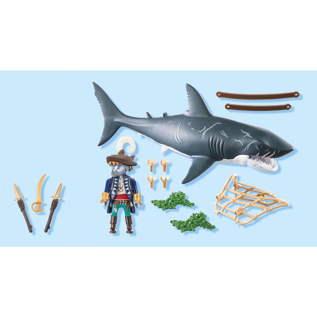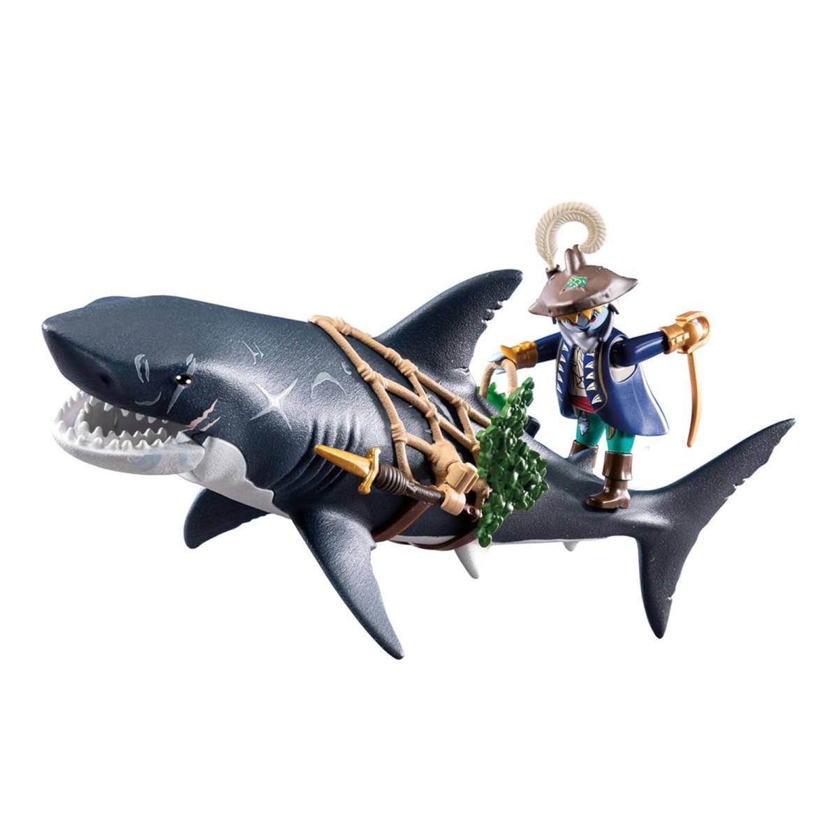 In den tiefen Gewässern der Piratenwelt lauern ein monströser Riesenhai und ein ruchloser Hai-Pirat! Durch einen Hebelzug öffnet sich das riesige Maul des Hais, in dem ein Pirat gefangen werden kann. Schnell wieder losgelassen, schließt sich das Maul automatisch. Auf seinem Ritt durch die sieben Weltmeere hält sich der Hai-Pirat mit gezücktem Säbel an dem Netz des Monsterhais fest. Der Riesenhai kann im Wasser schwimmen.