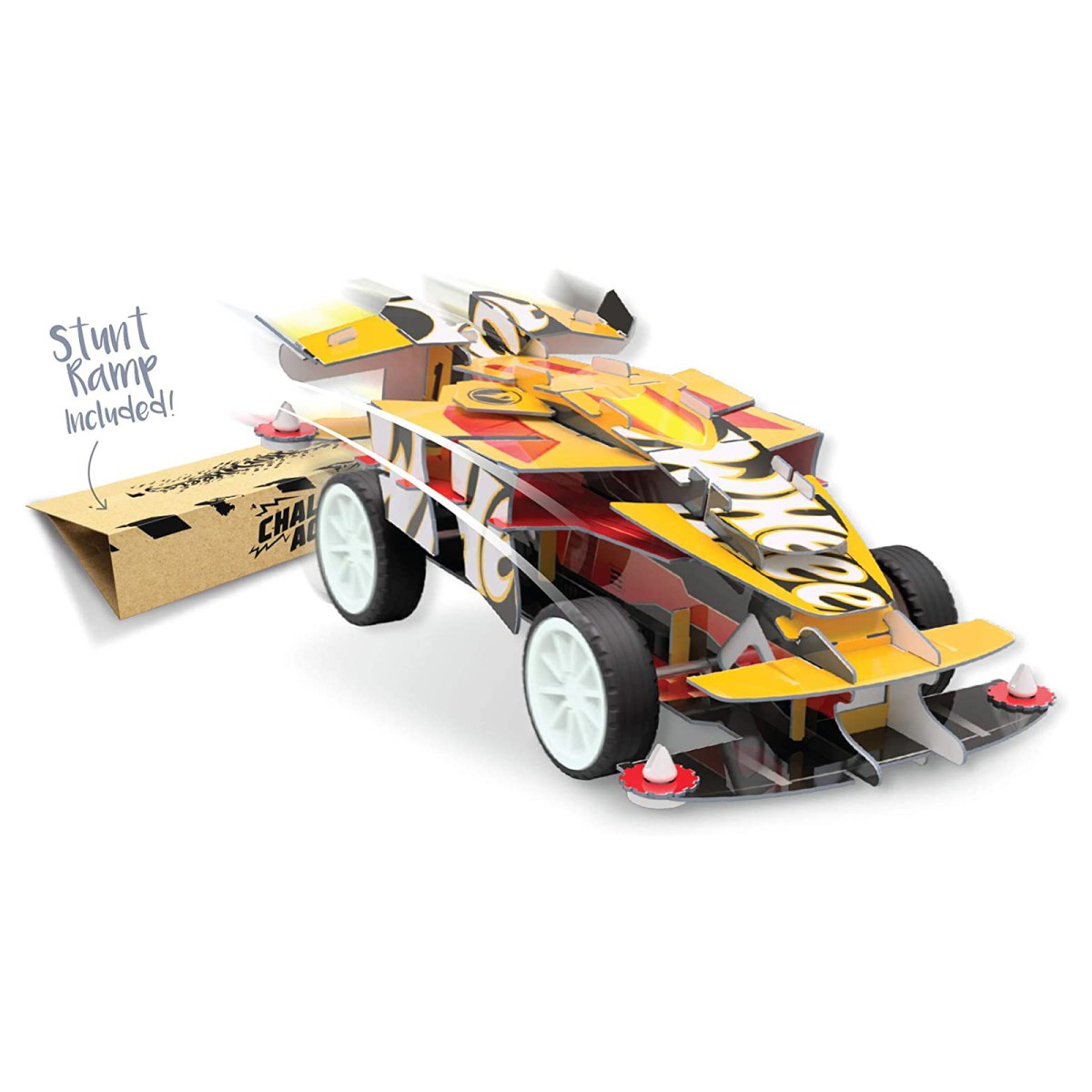 Nach dem Zusammenbau ist das Auto sehr robust und mit seinem doppelten Rückziehmotor bereit für rasante Hochgeschwindigkeitsrennen. Durch den doppelten Rückziehmotor werden für das fertige Modell nicht einmal Batterien benötigt. Das Modell lässt sich einfach zusammen bauen und ist bei Fertigstellung robust genug, um kleine Sprünge über die Sprungschanze zu absolvieren!