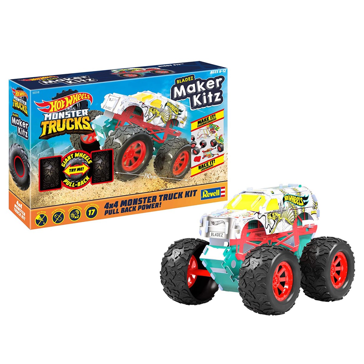 Nach dem Zusammenbau ist der Monster Truck sehr robust und mit seinem doppelten Rückziehmotor bereit für atemberaubende Hochgeschwindigkeitsrennen und benötigt dafür nicht einmal Batterien. Der Zusammenbau ist einfach und erfordert weder Kleber noch eine Schere. Durch den doppelten Rückziehmotor ist dein Hot Wheels Monstertruck bereit für die Sprungschanze.