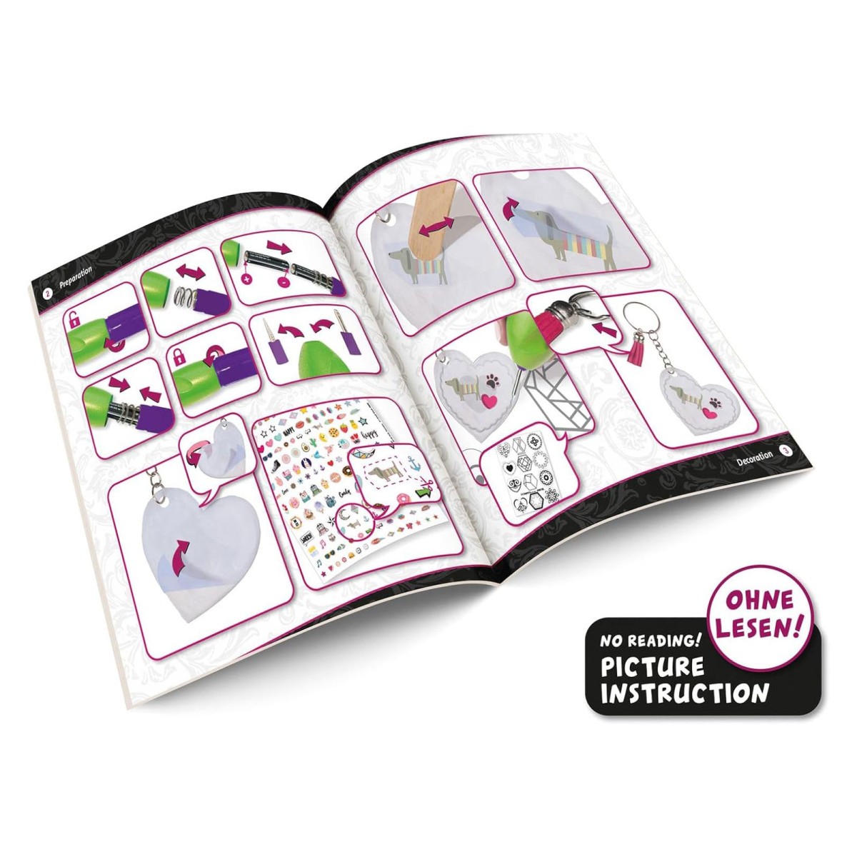 Das Set enthält 6 Acrylglas-Anhänger, Vorlagen, Metall-Ketten, Schlüsselringe, farbige Quasten, stylische Sticker und ein hochwertiges Gravurgerät. Mit ausführlicher, farbiger Anleitung. Durch das Gravieren und anschließende Verzieren werden Kreativität und Feinmotorik gefördert. Perfekt für kleine Designerinnen und Designer, die ihren eigenen Stil verwirklichen möchten.