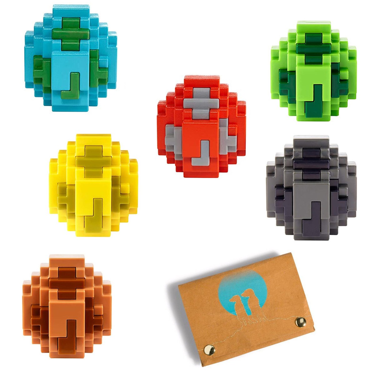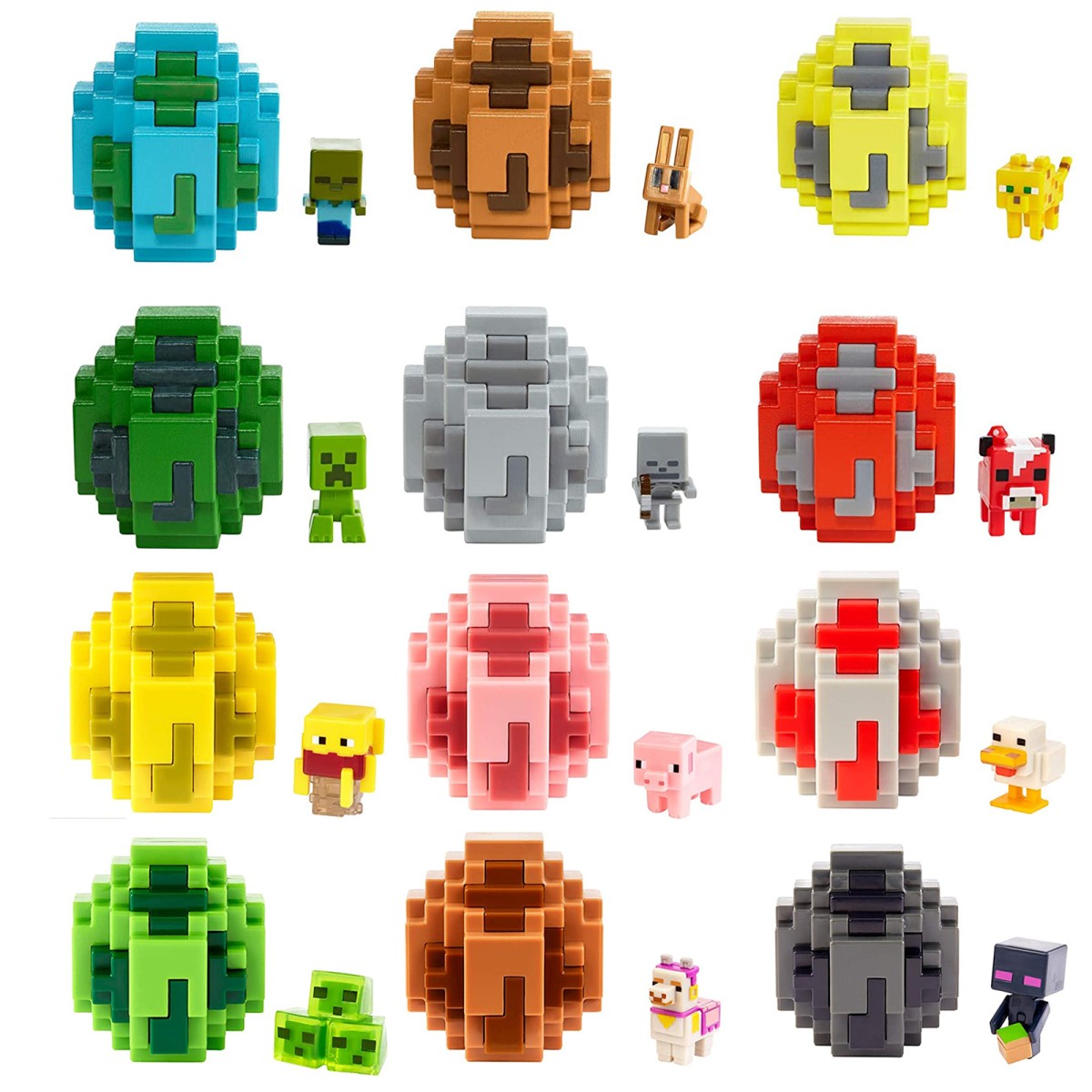 Es gibt 12 verschiedene Minifiguren, die in coolen Bällen im Pixeldesign verpackt sind. Diese können im Anschluss wieder zusammengesetzt werden oder als Plattformen dienen, um deine Pixelfiguren aus dem Minecraft Universum von Mojang noch besser zu präsentieren.