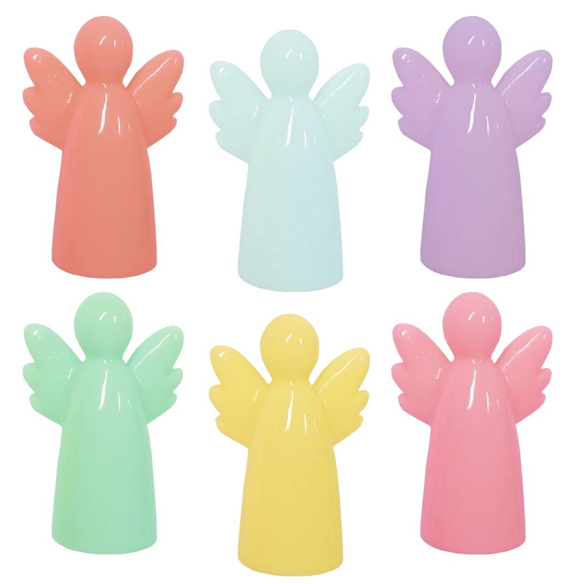 Die Engel haben sechs verschiedene Pastellfarben und haben eine Größe von ca. 2 x 2,5cm.