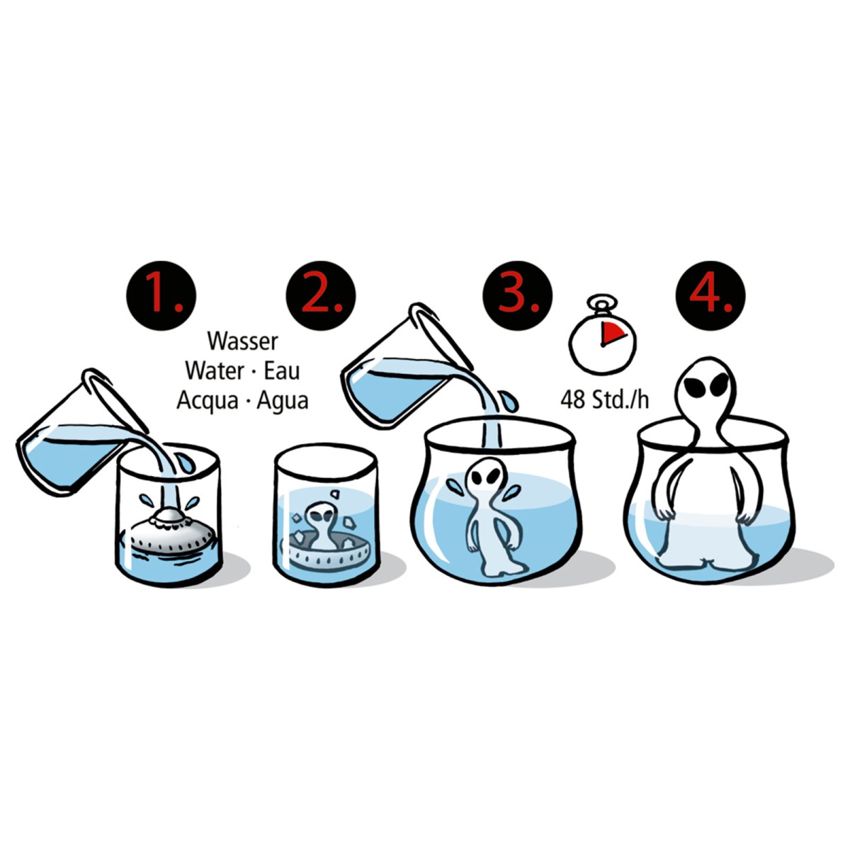 Aber das ist noch nicht alles! Wenn Sie das UFO in einen größeren Behälter mit frischem Wasser legen, wird das Alien weiter wachsen und im Laufe von 48 Stunden bis zu 12 cm groß werden. Es ist faszinierend zu beobachten, wie die Figur langsam ihre endgültige Größe erreicht und dabei immer mehr Details sichtbar werden.