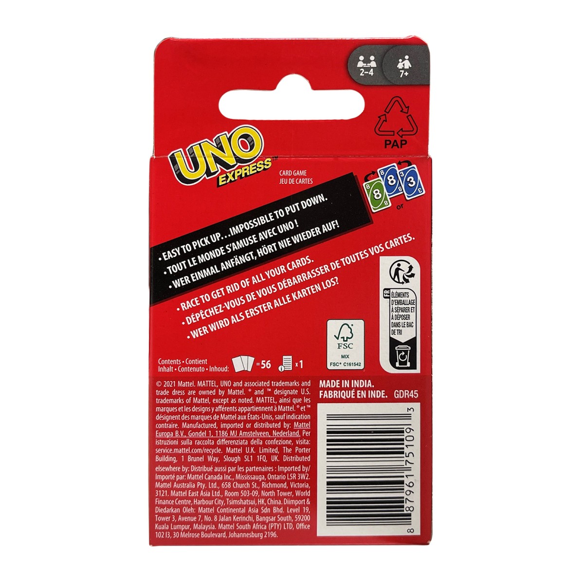 Das UNO Express Kartenspiel besteht aus 56 Spielkarten und bietet somit denselben Spielspaß wie das Original. Die Regeln sind jedoch etwas vereinfacht, um das Spiel noch schneller und leichter verständlich zu machen. So können auch jüngere Spieler problemlos mitspielen und die ganze Familie kann gemeinsam Spaß haben.