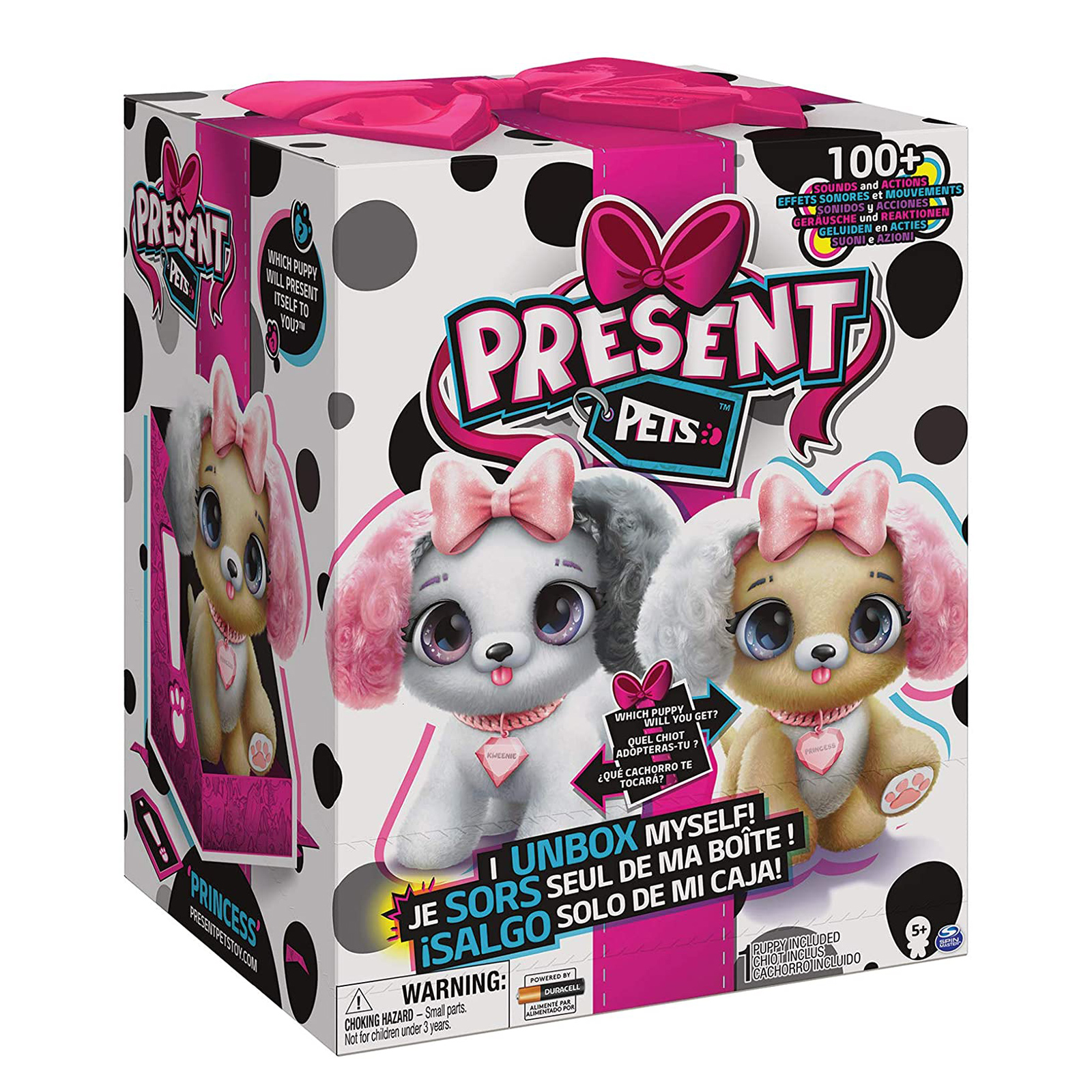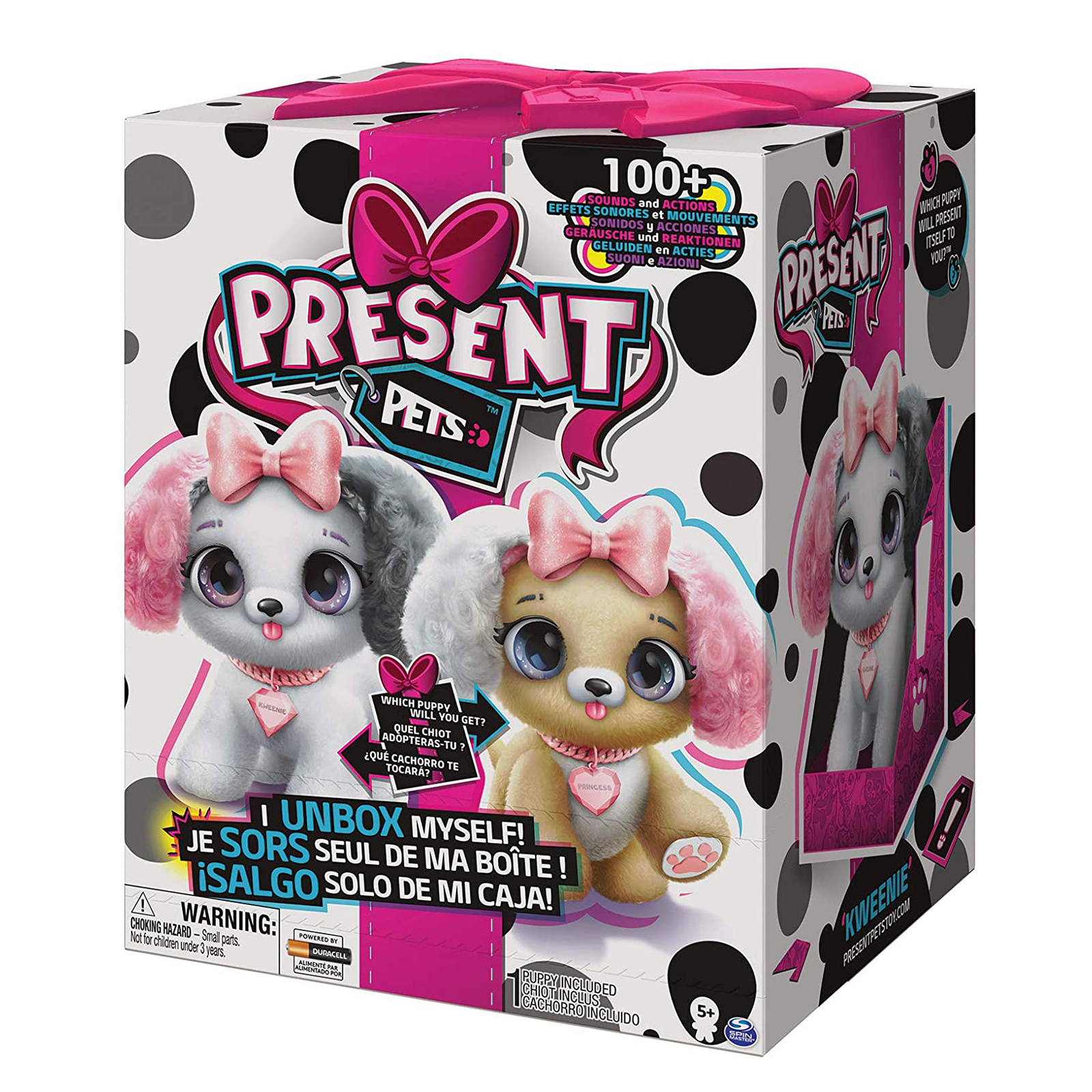 Die Present Pets sind bezaubernde, interaktive Plüschwelpen, die sich von selbst aus ihrer Geschenk-Verpackung befreien. Erst rappelt es im Karton und dann kommen die niedlichen Hunde-Babies nach und nach heraus. Erst dann ist zu sehen, welche Fell-Farbe sie haben.
