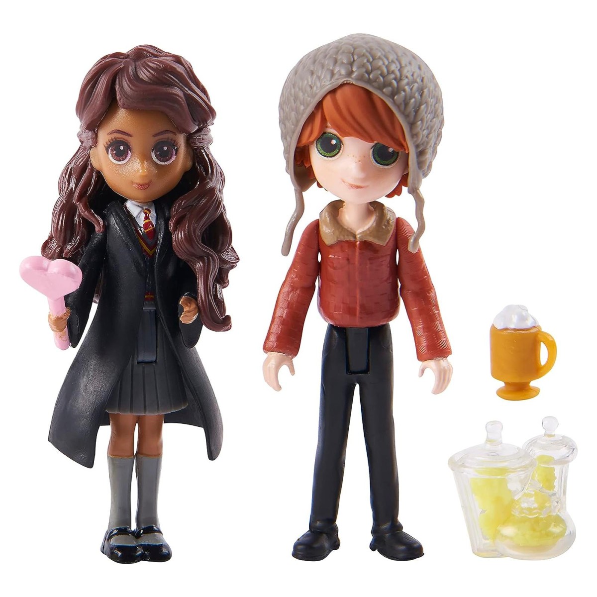 Im Set enthalten sind 2 Figuren und 2 Zubehörteile, darunter ein Butterbier und ein Süßigkeitenglas.