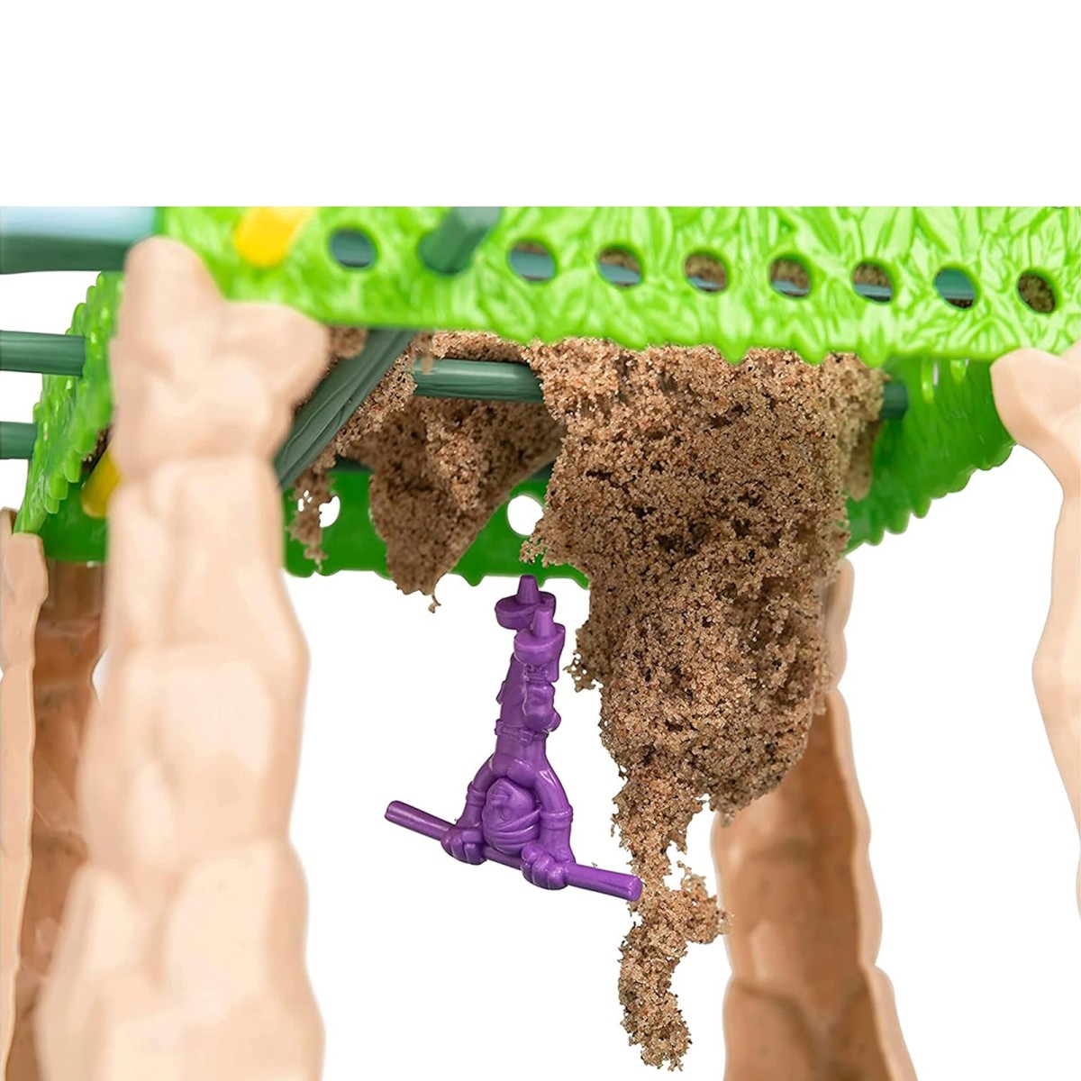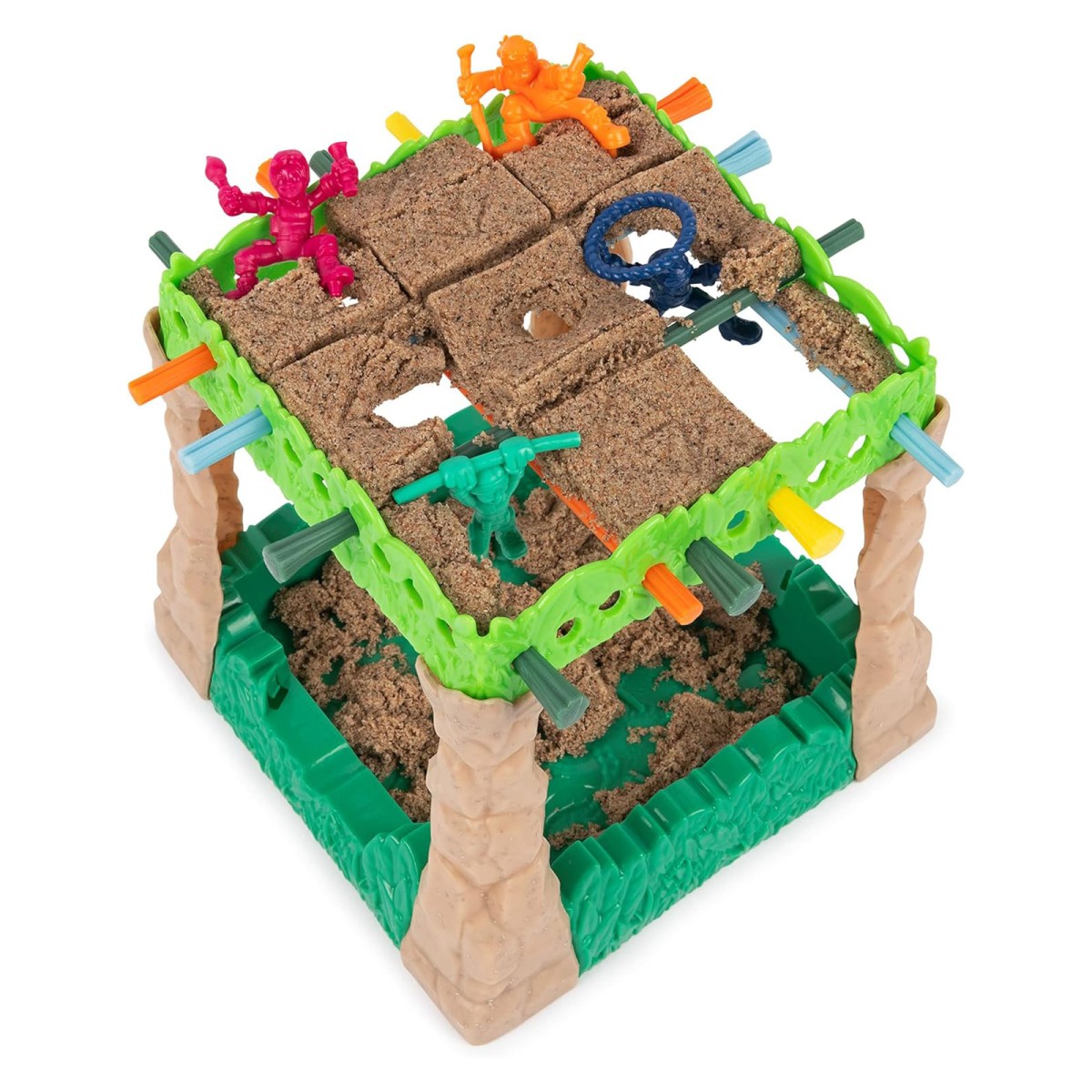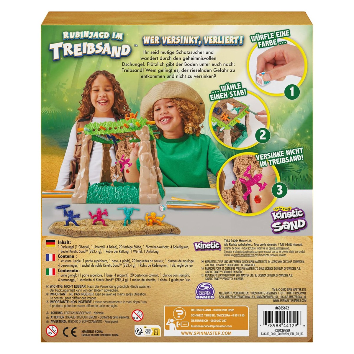 1 Dschungel (1 Oberteil, 1 Unterteil, 4 Beine), 20 farbige Stäbe, 1 Förmchen-Aufsatz, 4 Spielfiguren, 1 Beutel Kinetic Sand (283,4 g), 1 Rubin der Rettung, 1 Würfel, 1 Anleitung