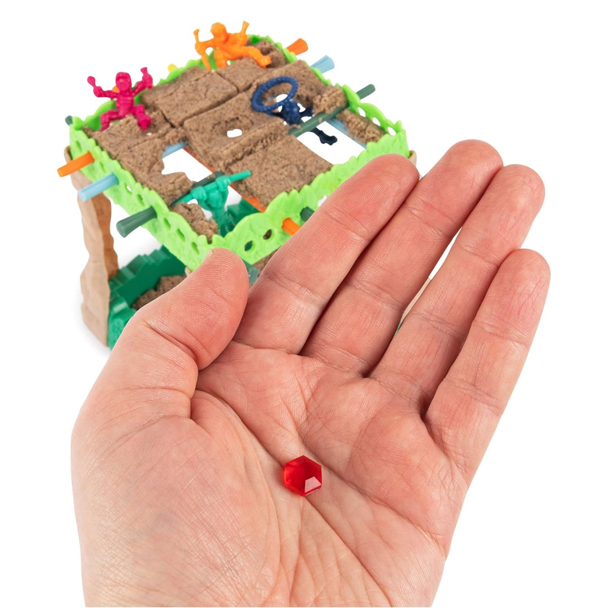 Der Rubin der Rettung ist im Sand versteckt. Wer ihn entdeckt und sich zuerst schnappt, darf seine abgestürzte Figur wieder ins Spiel bringen und stellt sie oben auf die Spielfläche … Und wird so vielleicht zum Helden des Dschungels. Rubinjagd im Treibsand: Spannung und Spielspaß für die ganze Familie.