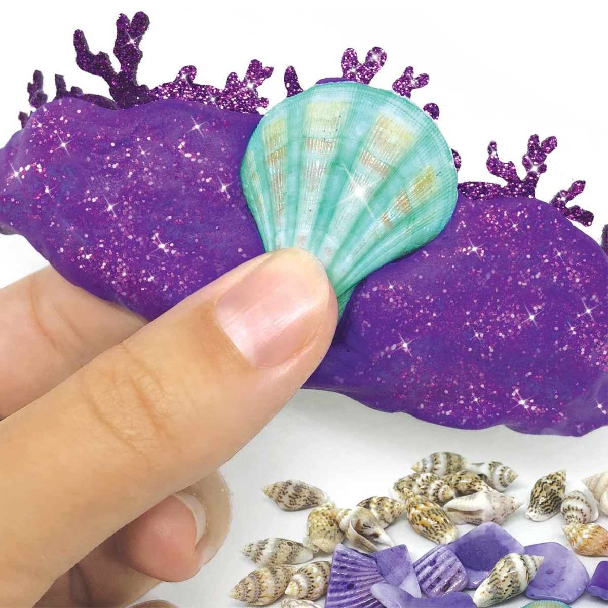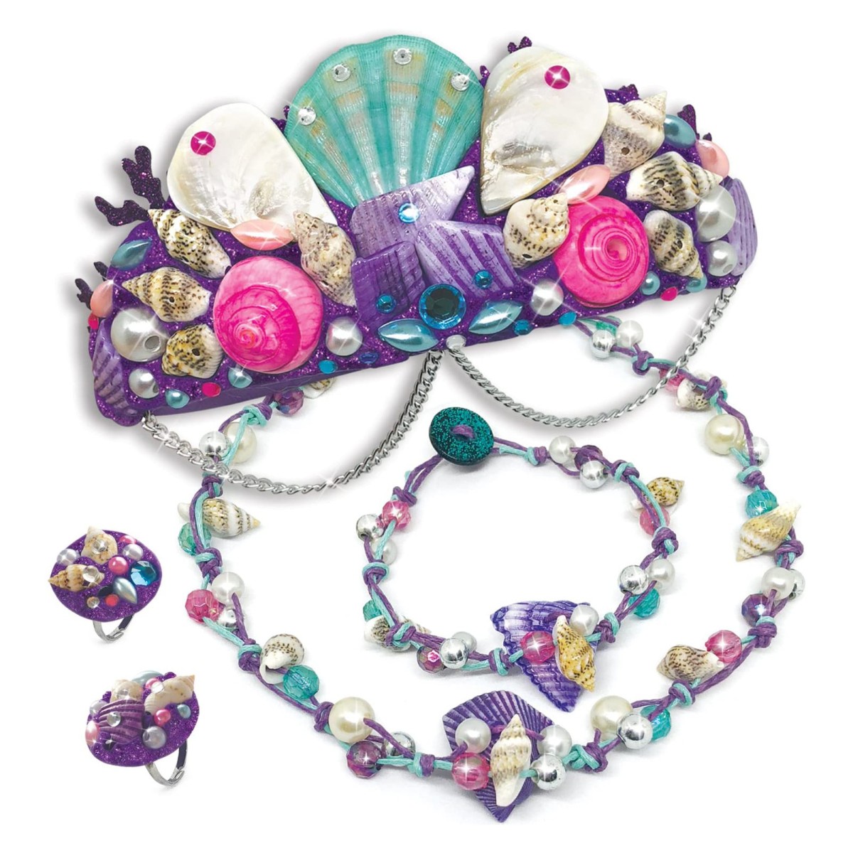 1 Lufttrockende Modelliermasse, 1 Anhänger - Bereit zum Dekorieren, 2 Wachsfaden, 1 Tube mit Glitzerpulver, 71 Perlen und Knöpfe, 36 Muschelschalen, 1 Kette, 2 Ringrohlinge, 4 Biegeringe, 55 Aufkleber mit Strasssteinen