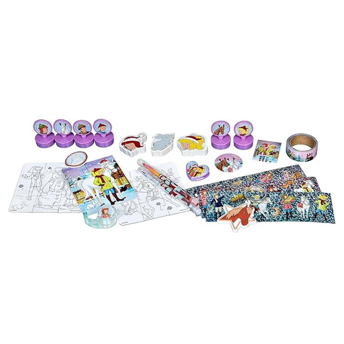 Mit thematisch passendem Inhalt präsentiert dieser Bibi & Tina Kalender eine bunte Mischung aus Bastel- und Spielspaß. Er beinhaltet neben Stiften, Ministempeln und Klebeband, zum Beispiel auch zwei Minipuzzle.